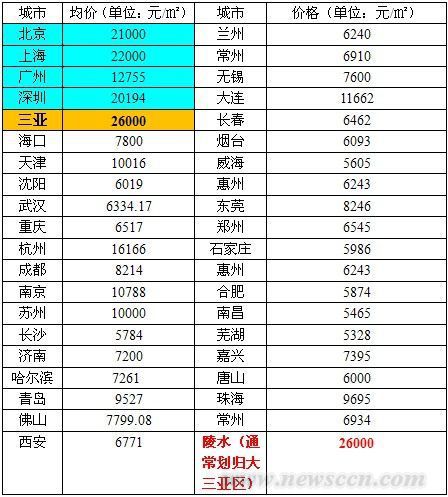 近日,新浪乐居对全国40大城市的2012年6、7月商品房成交均价进行了一次调查统计。结果显示:北京、上海、广州、深圳这四大城市的成交均价分别是21000元/平方米、22000元/平方米、12755元/平方米、20194元/平方米。而海南三亚市凭借26000元/平方米的成交均价远超北上广深等四大一线城市,成为目前全国房价最高的城市。