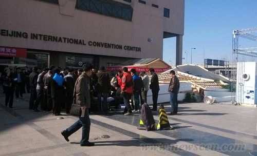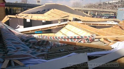 今天是第九届国际绿色建筑与建筑节能大会暨新技术与产品博览会开展的第一天,当记者来到北京会议中心门口时发现,本应该是北京门窗发展有限公司和远大住工等几家企业的集成房屋展示区域,远大住工的展台已被大风摧毁,完全坍塌,仅能看到房屋顶部,已辨不清原来的面目。