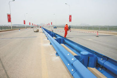 通车已经5年多的黄陂区盘龙大桥,4月17日终于完成了隔离栏的安装,真正实现盘龙大道全程双向隔离,这将大大增强该大道交通的安全性。 由中环线跨府河往盘龙城的盘龙大道,是一条跨达26米的标准大道,建成之初,整条大道都实行了双向隔离,但800米长的盘龙大桥上却没有隔离设施,来往车辆在交通繁忙时经常互穿,尤其到夜间,车辆乱串现象更加严重,导致该路段事故频发。本月15日起,交通设施部门开始进行钢铁隔离栏的施工,到昨日下午4时,南岸的隔离栏已经安装完毕,10个工人正在加紧安装北岸的隔离栏。 据悉,从今日起,整个盘龙大道全面实施双向隔离、车辆各行其道。 |