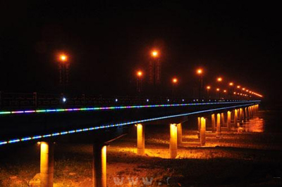 岷江大桥 2011年5月12日,记者晚上在岷江沿岸散步时发现,位于城边的岷江大桥变了样。不仅大桥上的路灯比起以前亮了许多,而且桥身也安装了彩色的灯饰,绚丽多彩,把彭山的夜景装扮得分外美丽。 记者从县市政园林管理局了解到,为了美化城市,给市民创造更加优美的环境,今年3月,我县启动了对岷江大桥的改造工程,对大桥进行了翻新和路灯改造。 据了解,此次改造共翻新、维修大桥护栏918米,安装路灯光源灯头34套、LED全彩数码管2000根、泛光灯90盏、点光源灯100个,美化、亮化后的岷江大桥给往来群众和车辆通行提供了极大的方便。 “路灯亮了,晚上散步走过来也舒心多了。整个岷江大桥也焕然一新。彭山城市更美了。”5月10日晚,市民张小姐说。 |