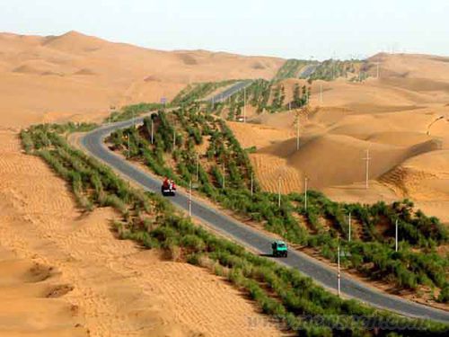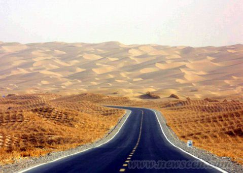 塔里木沙漠公路是目前世界上在流动沙漠中修建的最长的公路,也是世界上第一条建设在沙漠中的等级公路。这条绿化长廊是世界上第一条建设在沙漠中的“绿色长城”。 塔里木沙漠公路北起314国道轮台县东,经轮南油田、塔里木河、肖塘、塔中4油田和塔克拉玛干大沙漠,南至民丰县恰汗和315国道相连,南北贯穿塔里木盆地,全长522公里,其中穿越流动沙漠段长446公里。 塔里木沙漠公路是目前世界上在流动沙漠中修建的最长的公路。公路于1993年3月动工兴建,1995年9月全部竣工通车。 该公路北接轮南油田公路网与314国道连通,南与315国道相接,全长522千米。其中流动沙漠段公路北起肖塘,南至民丰县城以东23千米的恰安,全长446 千米。是世界流动大沙漠中修建的第一条等级公路。7米宽的路面平整如镜,阳光下反射着流畅的亮光。 1995年通车的沙漠公路,北起314国道轮台县东,经轮南油田、塔里木河、肖塘、塔中4油田。南至民丰县恰汗和315国道相连,南北贯穿塔里木盆地,全长522公里。其中穿越流动沙漠段446公里,是世界流动大沙漠中修建的第一条等级公路。7米宽的路面平整如镜,阳光下反射着流畅的亮光。林带总面积3000余公顷。现在沙漠公路两边20米宽的防沙护路林工程已经启动,利用太阳能抽水,使用较高矿化度的地下水滴灌。两年后,一条由数百万棵红柳、梭梭、沙拐枣等40种植物组成的绿色走廊将贯通世界第二大沙漠。在丝路南道途中,就可以看到浩瀚沙漠中的伟大景观了。 沙漠公路是国家“八五”重点科技攻关项目,先后由17个科研单位、180多名专家和技术人员参加了攻关,攻克了在流动沙漠中修筑上等级公路的一系列世界级难题,项目研究达到了国际领先水平。该沙漠公路路基宽10米,黑色路面为7,它采用了强基薄面路面结构,沙基振动干压实和土工布加固沙基的施工工艺及芦苇防栏和芦苇方格防沙治沙体系。公路路面平整如镜,汽车时速一般都在100千米以上,最高可达150~180千米。 沙漠公路的贯通对加快塔里木盆地油气勘探开发、促进新疆经济发展和政治稳定将发挥重要作用,同时也为国内外游客深入塔克拉玛干大沙漠腹地,开展沙漠探险旅游创造了良好的条件。如今在轮南镇沙漠公路 0千米和民丰县恰安沙漠公路的终点处都建有壮观的沙漠公路彩楼,门楼旁立有宏伟的沙漠公路简介纪念碑。彩楼两侧书写着“千古梦想沙海变油田”、“今朝奇迹大漠变通途”的巨幅对联。当汽车驶入被人们称作“希望之路”和“幸福之路”的沙漠公路时,不禁使人思潮起伏,感慨万千! 沙漠公路从东北向西南纵穿了塔克拉玛干沙漠的腹心地区,沿途依次穿越了三个风沙地貌单元。在塔里木河沿岸一带,是属于具有零星复合型沙丘链的塔里木河沿岸灌丛沙丘区,这里的沙丘都为固定或半固定的,高3~5米不等,地表有不少红柳和胡杨树生长, 在塔中路28千米和44千米等处, 公路两旁出现了大片奇形怪状,因为断水而枯死的胡杨林。 |