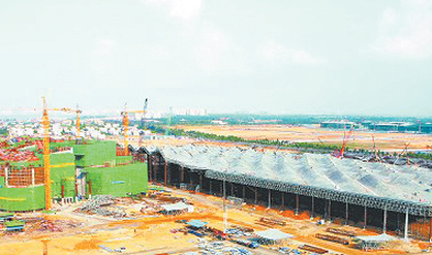 | 本报讯 连日来的高温酷暑,并没有减慢海南省重点工程海南国际会展中心的施工进度,该会展中心已现雏形。 据了解,该会展中心部分展馆的钢结构屋顶已完工70%,有望在本月底实现钢结构屋顶全部封顶。另外,该会展中心的配套五星级酒店已经开始建设。 图为海南国际会展中心。 ![]() |