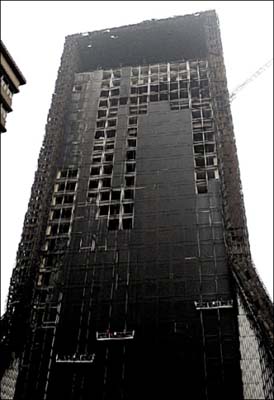 昨天,路过央视新址的市民发现,因火灾被烧的央视新址配楼已经开始修缮,北侧外墙的玻璃正被拆除。记者获悉,近日该楼进行了实验性拆卸玻璃工作,但如何实施复工并没有最终的方案。目前,针对该楼的施工方案,专家仍在研究当中。 昨天上午10点,记者来到央视新址。配楼北侧外墙上挂着四个施工的吊台,每个吊台上约有四五个工人,正戴着安全帽施工。因吊台悬在约20层楼的高空,难以看到施工细节。央视新址配楼的东、西两侧外墙破败不堪,只能看到烧焦的“骨架”。其北侧外墙,下部分三分之二的墙体玻璃仍在,上面几层的玻璃已经拆除。在央视新址的北门,七八名保安正在值守。当记者询问被烧大楼何时修缮完毕时,多名保安均表示“只负责保卫安全,其他情况不知道”。中午11点左右,多名工人从北门走出,他们头戴“中国建筑”和“北京城建”的安全帽。工人们表示,他们目前正负责央视新址主楼的施工,“不知道正在修配楼的是哪个公司的工人”。 据附近的居民介绍,央视配楼的修缮工作开始至少两个月了,每天都有工人从“过火楼”上扔下很多被烧后废弃的材料。 |