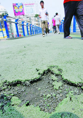 核心提示 造价700多万元的郑州市东风路文化路人行天桥,修成仅1个多月,就遭“破相”。有市民投诉,新竣工的桥面上铺设的塑胶地垫是“豆腐渣”,高跟鞋一踩就碎,桥面和台阶上到处是坑坑洼洼的洞。该天桥上使用的也是和花园路人行天桥类似的塑胶地垫。为此,很多市民不禁质疑,花园路人行天桥的塑胶地垫屡次破损,为何有关方面还没“长记性”?而天桥设计方称,此工艺在外地天桥应用上常见,不知为何到郑州却“水土不服”! 目前,此天桥的问题已引起郑州市政府的高度重视。昨天(17日)下午,市政府有关人员专程赶到现场召开协调会,让施工方和设计方尽快拿出合理方案,妥善解决天桥的“破相”问题。 郑州市花园路花园商厦门前的人行天桥使用的塑胶地垫,不是今天脱层,就是明天“起包”。这可苦了施工方,先后修了6次。 在花园路人行天桥屡出问题的“塑胶地垫”,如今又被用在了新修建的东风路文化路人行天桥上。这不,没几天,这些塑胶地垫就出现了脱层、起包,变得坑坑洼洼。“花那么多钱修建的天桥,刚开通没多长时间就变成这样,看着真让人心疼啊。”市民说,“在一个地方跌倒了,总得长点记性吧。花园路人行天桥的教训,咋就不知道吸取呢?” |