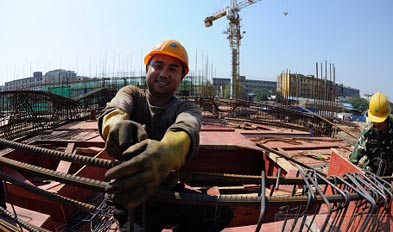 5日,湘潭新火车站候车大厅二层工作平台,工人们趁着良好的天气抓紧施工。 (记者 刘建强 摄)