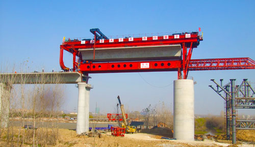 : 架桥机在东线东与合肥绕城高速公路接壤处桥台架设最后一孔箱梁 正在落梁