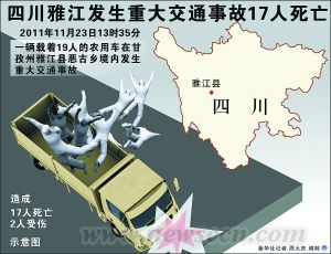截至上午9时许,大雾才渐渐散去。11时左右,现场救援工作和事故现场勘察全面结束,路面恢复通畅。湖北省公安交通管理局局长马国宪介绍,事故系一辆从宜宾至上海的客车超车时操作失误,造成30余后来车辆连环追尾。 据了解,车祸现场共造成3人当场死亡,27人受伤。伤者第一时间全部就近转移到仙桃市第一人民医院和中医院。其中仙桃市第一人民医院收治的26人中,有3人重伤经抢救无效死亡,其中1人为1岁半男童,其他伤者情况基本稳定。 新华社成都11月23日电(记者 黄毅)记者20时30分从四川省安监局获悉,23日中午,四川省甘孜藏族自治州雅江县发生一起重大交通事故,造成17人死亡,2人受伤。 据了解,23日13时35分,一辆载着19人的农用车在甘孜州雅江县恶古乡境内发生重大交通事故,造成17人死亡,2人受伤。目前,2名伤员已送雅江县医院救治。 事故发生后,甘孜州、雅江县党委政府有关领导率公安、交通、安监、卫生等相关部门负责同志立即赶赴事故现场,开展施救和事故善后处置工作。 四川省政府副秘书长蔡竞、省政府安办主任林书成及省政府应急办、省安监局、省交通运输厅、省公安厅交警总队、省农业厅农机监理总站等单位负责人正在赶赴事故现场。 相关新闻 辽宁高速公路严禁超55吨货车上路过桥 据新华社沈阳11月23日电 辽宁省交通厅23日宣布,从12月1日零时起,对行驶全省高速公路总重超过55吨超限货车车辆进行专项治理。在进行阻截劝返同时,加大对车货总重超过55吨车辆通行费的加收力度,从根本上消除超限车辆利益驱动。对超过55吨的部分按基本费率的16倍加收通行费;未超过55吨的部分和对车货总重低于55吨的普通超限车辆,仍执行现行标准。对车货总重超过55吨的绿色通道车辆,不再免收车辆通行费,按普通超限车辆对待。 |