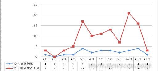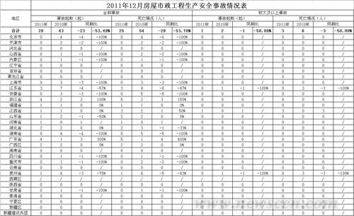 摘要: 一、总体情况 2011年12月,全国共发生房屋市政工程生产安全事故20起、死亡25人,比去年同期事故起数减少23起、死亡人数减少29人,同比分别下降53.49%和53.7%。 2011年12月,全国有10个地区 ...