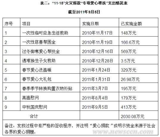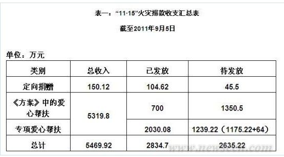 摘要: 11.15火灾捐款收支汇总表 据《劳动报》报道,记者从上海市慈善基金会静安分会获悉,截至2011年9月5日,共收到社会各界1115火灾捐款5469.92万元,已发放2834.7万元,剩余款项2635.22万元。社会捐赠款在使用和 ...
