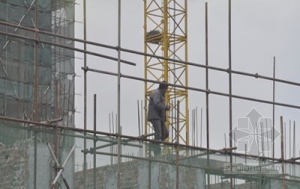 一位施工员工未配置任何安全措施置身高脚架上 该建筑工地的施工人员绝大多数都未按规定采取安全措施。