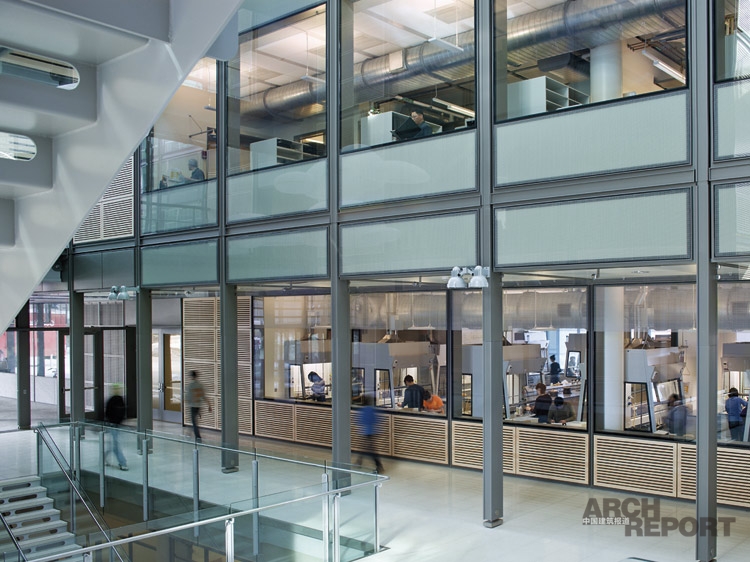 项目名称:美国普林斯顿大学弗里克化学实验室设计者:霍普金斯建筑事务所 项目地点:美国 新泽西 委托人:普林斯顿大学 建筑面积:22 296㎡ 建成时间:2010年 摄影:Bill Lyons 该实验室建筑为化学系注入了新生活力,并将教学和高水平研究空间融合在一个设施内,增强了互动、合作和创造力。设计使员工办公室和实验室研究空间主要的项目因素通过体块表达出来:办公室位于面朝校园林地的塔楼,而实验室位于后方一个隐蔽的线型体块内。 建筑的焦点是一个22.86m(75英尺)高的中庭,充当中心流动区以及交流和集合空间,并提供了观赏周围空间内外景致的视野。弗里克坐落在邻近历史校区南侧主入口的一处十分明显的场地上,是巩固相关院系、力求将校园打造成为更大的新“科技园区”的行动中的一部分。 设计的主要目标之一是为全美范围内的化学研究建筑设立节能设计新标准。为此,项目融入了若干可持续性特征,包括美国最大的集成光伏阵列之一、预先制造的外立面、灰水回收系统和冷梁;此外,广泛应用自然照明,室内整体安装日光感应器。 感谢霍普金斯建筑事务所将项目介绍和图片授权中国建筑报道网发行。