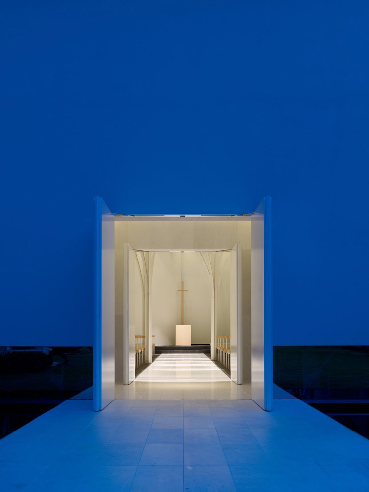 这座小教堂建在一个既存的花园内,花园一直用来举办婚礼活动,周围被树木所环绕。礼拜堂看起来像一个简单的白色盒子漂浮在空中,与既存的花园环境和谐统一。建筑师将花园中的树木作为设计主题,并提出了随意设置树形柱的礼拜堂建造方法。