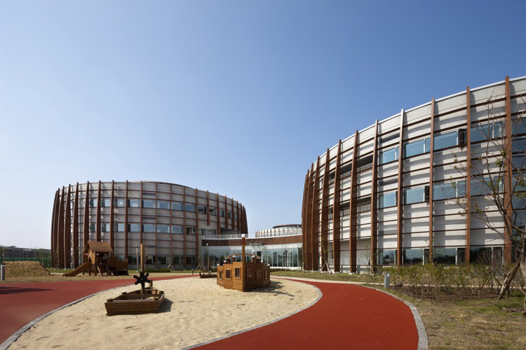 建筑设计由济州岛的当地特点、场地物理特性以及各种功能要求发展而来。设计中引入了地域元素与文化元素,如茅草屋顶、小径和橘子树等,将所有建筑有机地联系在一起。结构布局很像树枝上的叶子,表现了其作为加拿大学校分校的身份。这所寄宿学校体现了整个校园的重要核心价值,如场地与景观的结合、校园道路的“交叉”、各功能空间的平衡“交织”以及不同形式的和谐“互动”。设计中还引入了可持续发展元素,用以创造一个生态意识教育场所。屋顶的雨水被安装在学校大堂内的收集管收集起来并被回收利用。学校中央大堂也是主入口区,有一个三层楼高的大规模室内公园欢迎着来访者。建筑外覆盖了铝百叶,能控制光与热,同时还能保护来访者的个人隐私。百叶窗的变化使每座教育建筑的立面都有着鲜明而又统一的外观。