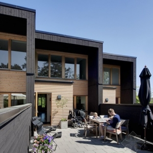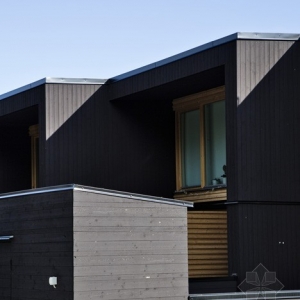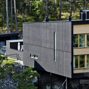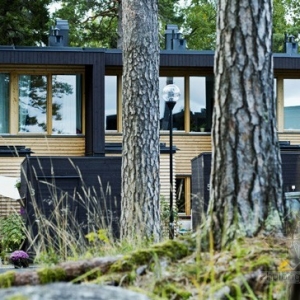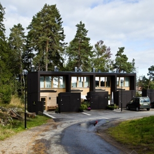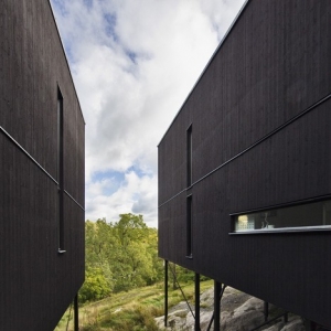 由斯堪的纳维亚公司在瑞典开发的住宅项目里,变黑的木建筑正在悬崖的边缘上摇摇欲坠,古斯塔斯斯伯格镇位于斯德哥尔摩东面,建筑师Arkitema在接近古斯塔斯斯伯格镇旁,设计了22个在山谷沿边的家庭住宅。“Prastgarden位于顶部岩石区的一片安静地,在这里可以俯瞰起伏的景观和四周的松林”,建筑师说。土地随着随着而来的建筑逐渐消失,在岩石堆里有一些石尖露出来,以此撑起整个结构。厚黑的木头壁框把个人空间区分开。两层楼的房子分布在四排梯田地里面。木头建筑参考了斯德哥尔摩群岛的当地乡土建筑。屋顶倾斜向上,直面峡谷,后面房间的设计能够观赏到森林景观。