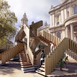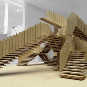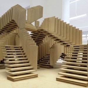 无休止的构架和这些结构能够实现的可能性,推动了英国公司dRMM去探寻这种无穷无尽楼梯的潜力。临时雕刻的一系列的单独的楼梯,可以彼此交错,一个有框架,有规模的三维运动模式,有时候,会是死路一条,但有时候却可以通向某处。每个组件的预制建设都是非常重要的,这样便于拆卸和添加。有了这样的部件,就可以很容易的被安装在其他建筑上。这个“无穷无尽的楼梯”将在2013年9月13号到10月10号的伦敦设计节上被安装在泰特现代美术馆前面。该项目是由美国硬木出口委员会赞助,整个设计中,都采用可持续利用的郁金香木,并提供非凡的力量和重量对比。