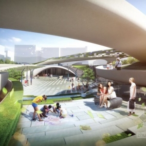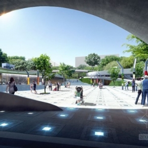 为了延长了南北之间的连接通道,方便往来人群穿越,设计师安装了一座天桥,不仅连接了中央公园和绿化带,而且增加了中央广场的观赏功能。于此同时,西边的商务区则利用下沉式广场来增加绿化面积。天桥上覆盖着太阳能电池板、玻璃、绿墙和LED灯。走过天桥的游客,通过他们的移动控制LED灯的电力,从而收集来自太阳能电池板的能量。这些互动系统,促进了人与人之间之间的沟通,使得广场活力倍增。下沉广场也被设计师引进了很多装置,以此方便人们的活动。此外,设计师还为中央广场设置了以供地下购物中心。设计师通过自然采光和打孔通风来保证地下的活动正常运行。此外,设计师还运用了多种环保的元素,如梯田式雨篷和雨水收集设施,利用地热和太阳能收集并节约能源。整个中央广场就是一个提供各种多样化活动的有机体。
