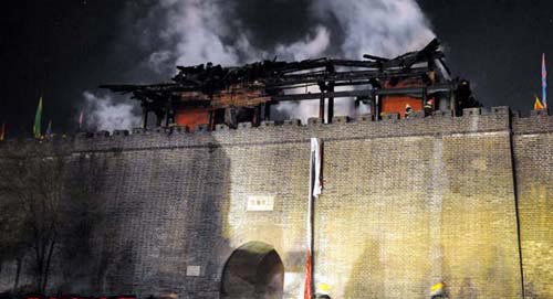 千年古城门毁于一旦 正定古城城南的南城门(长乐门)2月18日20时20分许突燃大火。经过石家庄市、正定县消防官兵数百名消防战士2个多小时的全力扑救,截止到22时30分,正定南城门大火被基本扑灭。据悉,正定南城门城墙上的三层古建城楼被毁,附近老建筑未受影响。目前起火原因正在进一步调查当中。 |