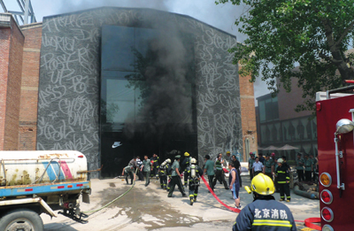 昨日中午时分,798院内B区一处正在装修改造的建筑内突然着火,黑烟弥漫在798上空,几公里之外都能看到。消防人员赶赴现场迅速将火势控制,所幸未造成人员伤亡。据施工人员估计,火灾可能是另一位工人施工不当引燃了塑料所致。 中午12点半,798院西北门的空气中弥漫着浓浓的烧焦味儿。走近着火的6号建筑发现,火已被消防人员扑灭,门口还冒着淡淡的几缕烟。“火势不算大,主要是黑烟很重。”消防人员称,他们赶到十多分钟后,火苗就被扑灭了。 “着火时间大约是上午11点半吧,看到对面有工人往外跑,头顶上还冒着一股浓浓的黑烟,紧接着我们就闻到了刺鼻的烧焦气味。”对面画廊工作人员表示,“黑烟最浓的时候,几乎看不到对面的建筑了。”另一位目击者王先生说,当时他正驾车行驶在京密路上,“只见右前方腾起一股黑烟,足有几十米高。刚开始我还以为五环路上有车自燃了呢,车开进来才知道是798艺术区里着火了。” 着火的6号建筑是一个上千平方米的老厂房,南侧大门口上方贴着一个耐克公司的标识。据了解,该建筑平时承接一些展览或搞一些篮球活动等。“这个标识估计是上次承办活动后留下的。”旁边一餐饮处工作人员透露。 门口堆放着一堆塑料材质物品和将近20个高约1.5米的液化气瓶,“幸好我们当时及时将这些液化气瓶先搬了出来,否则后果不堪设想。”一位工人称,火灾原因可能是有人施工时不小心,将火星儿崩到了塑料上。不过,具体原因仍需相关部门调查。 厂房内部已是一片狼藉,脚下是浸着黑灰的污水,施工架子斜倒在地上,一些零散的建筑材料堆在墙边。建筑东侧玻璃窗全部被打开,几扇窗户的玻璃已碎,散落在地上。 至于这间厂房改造后将用作何用,工人们均闭口回避,“我们是老板雇来施工的,一会儿他就过来,你直接问他吧。”但直到下午两点,消防人员和工人均已散去,也未见这位神秘“老板”的身影。