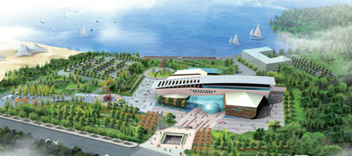 中国地质博物馆烟台馆位于莱山区国际植物艺术博览苑用地西侧,北靠黄海、西临游艇中心和大型度假村、南接滨海路。景观设计面积约 7.9万平方米,建筑设计以海浪—岩石为景观元素,构筑其一幢。