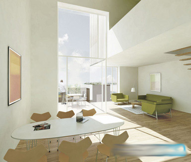 高端住宅楼(图片来源:自由建筑) 能耗的降低主要是通过错列后光照的最大化以及智能照明、太阳能取暖和热回收等技术。此外,这些排屋都建造了一个绿色屋顶系统,种植野生的忍冬和草药。公共庭院里的景观池塘将收集雨水,转变CO2,并为生态多样性提供丰富的场地。 |