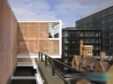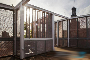 Skyroom (图片来源:百度) David Kohn事务所在伦敦南部的建筑基金会屋顶设计了一座“Skyroom”。基金会所在建筑名叫Magdalen屋,是用钢建造的,有着铜网立面和落叶松地板。 由Lake Estates出资建造的Skyroom顶部有6张EFTE垫子,构成了一个中央庭院和一座悬垂于索思沃克区Tooley街上方的阳台。 作为保护区,该项目受限于现有屋顶非常有限的结构容量,为此设计者建造了一座钢质平台,穿过屋顶将负荷传递给了现有建筑。 Skyroom从设计到建成仅用了8周时间,在伦敦设计节开幕之际及时开放,并将在该活动期间使用。 |