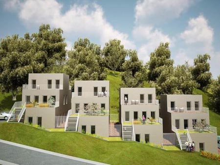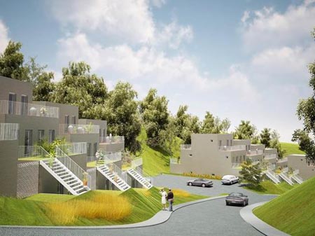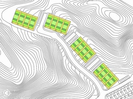 全景图 基地是一个倾斜的陡坡,而NL architects选择了基地上最陡峭的部分,这一区域被森林包围且可以远眺附近的山谷和北面汉江。这个方案由一个重复的二层单元建筑组成,每两个单元相互堆叠:单层平方建在首层,二层公寓布置在顶部。4个单元建筑为一组,每组建筑群都以阶梯式序列排布。