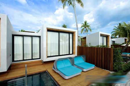 这些豪华别墅的规模和风格不一,但都有私人泳池和无敌海景。其中5座别墅有私人花园,而即将投入使用的总统套房面积130平方米,有一个巨大的户外泳池。其他的别墅可举办大型的聚会。玻璃的大量使用模糊了内外部空间的界线,天然材料如柚木结合进混凝土设计当中。