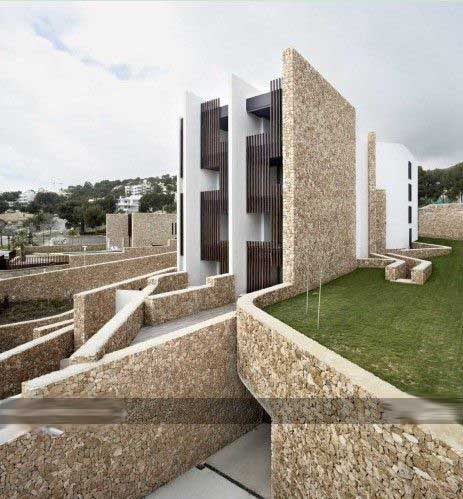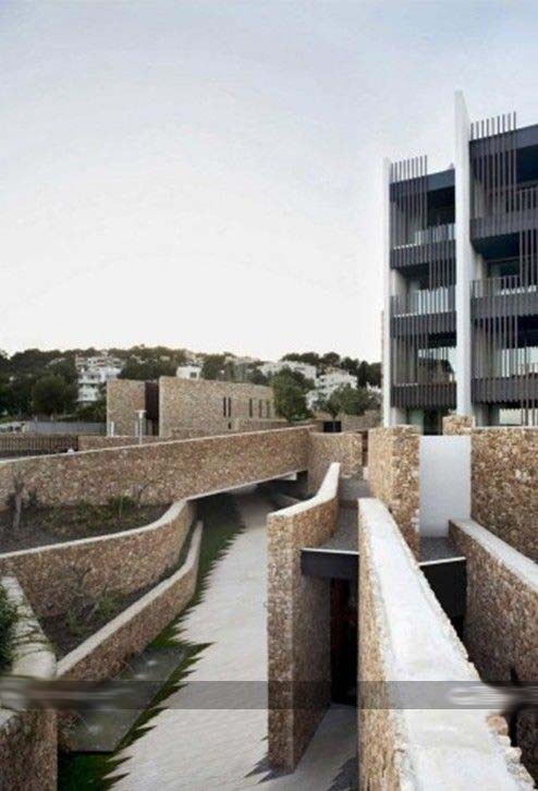 场地设计 设计师将新建筑设计为山谷状,用以唤醒当地的原始回忆——阶梯状的露台曾经被用于当地古代的农业活动。山谷将新区域与主建筑连接起来。干石墙与土地一同位于新区域之上。有时候,干石墙、土地将与斜坡、露台一起构成主建筑通向大海的日光浴场所。本地的沙土与石墙一道创造出一种理想的环境,使其与周边建筑脱离开来。