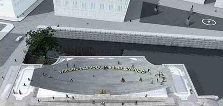 (图片来源:ABBS) 这个钢铁雕塑的表面将设置1989年的一条标语:Wir sind das Volk. Wir sind ein Volk. (我们是人民,我们是一个人。) |