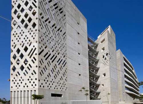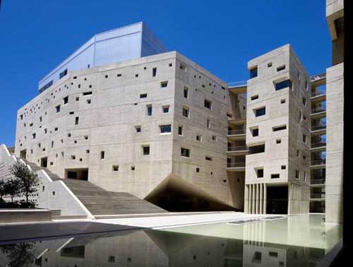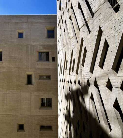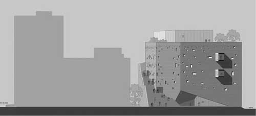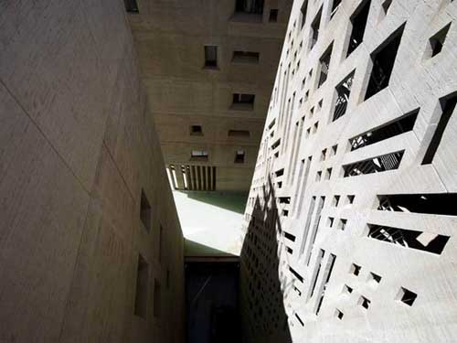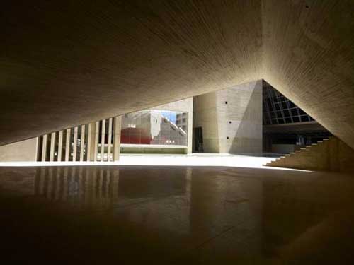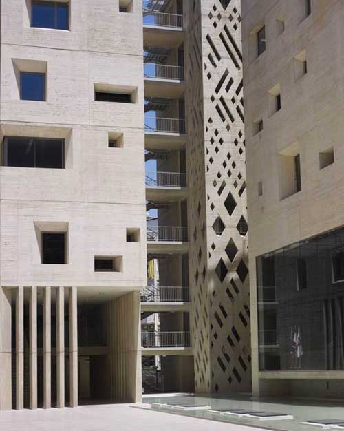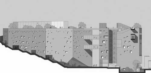 正立面和中心户外集会空间 光,是东方建筑中不可或缺的元素,它在立面设计上发挥了重要作用。这座建筑的表皮由许多马塞克式的孔洞组成,让直射光线和模糊的散射光都能够穿透建筑立面射入室内,从而创造出变化丰富的光影效果。同时,这些开孔还作为城市文脉的入口,向人们展示了黎巴嫩内战之后留下的城市废墟。