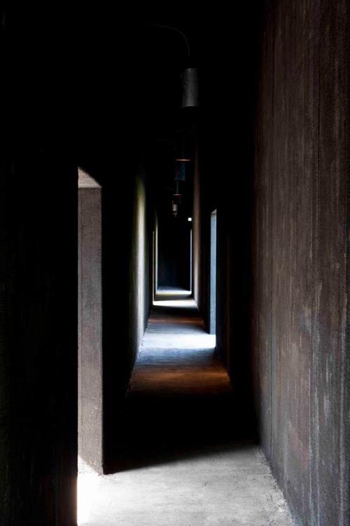 室内走廊 这个方案完成了zumthor“hortus conclusus”的概念,他将设计重心放在建筑与植物之间所营造的综合体验上。zumthor在建筑的轻质木框架上包裹了一层棉麻和一种黑色的糊状泥沙混合物。当参观者穿越几条昏暗走廊,自然光像溪水一样断断续续的洒下。建筑独特的材料将参观者从熙熙攘攘的都市生活中抽离出来,渐渐融入到这个隐秘而亲切的室内空间中。