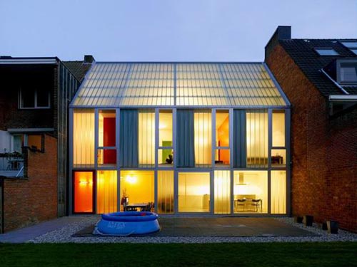 庭院立面效果 与临街立面形成鲜明对比的是面朝庭院的立面设计,建筑师采用了半透明材料。巨大的落地玻璃门让室内空间可以延伸到户外花园中。这种透明的处理为内部空间提供了丰富的自然光,同时将室内外的氛围和元素融合一体。在平面布局上,居住空间布置在庭院一侧,其中包括起居室、餐厅、厨房、卧室等,而其它的服务功能则布置在临街一侧。