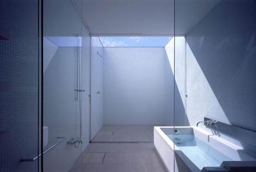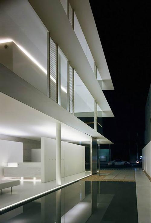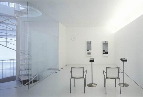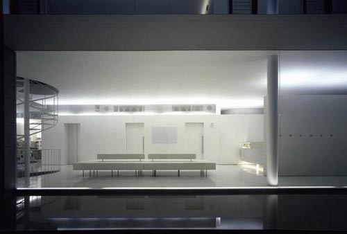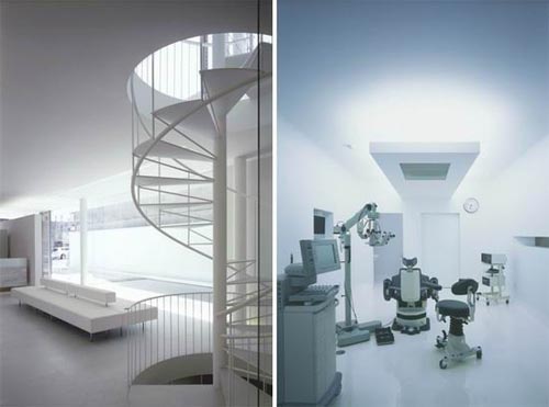(左)街景;(右)水池 紧挨玻璃体量的实体建筑作为诊所的手术楼。建筑外部包裹了一层银色金属板表皮,室内空间尽可能的保证私密性。这个兼具两种语汇的方案不仅满足了不同功能的需求同时还创造了十分“开放”和“封闭”的空间。