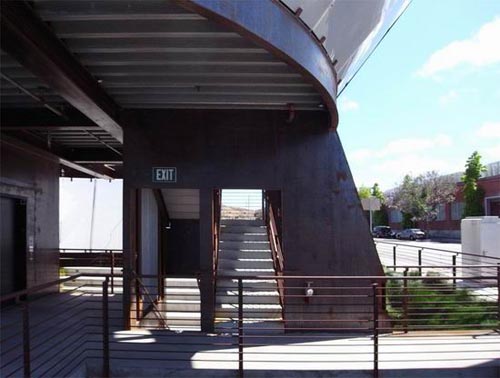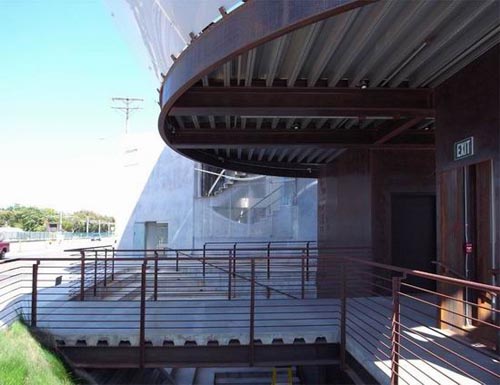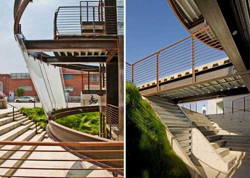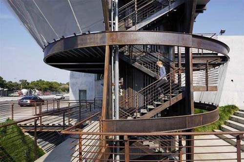 (图片来源:designboom) 临街立面效果 在垂直方向上,共有五个直径30英尺的圆形钢圈层叠在一起,组成整个建筑物。这些圆形体量在平面上前后左右的偏移,以创造出可以观赏不同景色的视角。建筑背面由一系列延伸出去的平台,它们进一步连接了城市和地面上的创意中心。