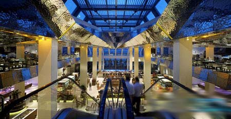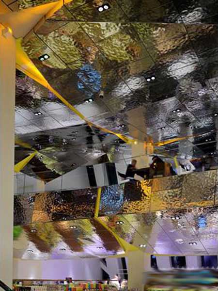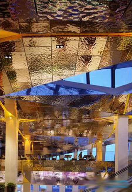 (图片来源:自由建筑报道) 这座商场坐落在莫斯科著名的19世纪花卉市场内,因此改造工程参照了过去的色彩,并将繁忙的情景反映在天花板上。天花板在内部是悬垂的,用2600块不锈钢部件组成,并且高度抛光,客户对改造的效果非常满意。 |