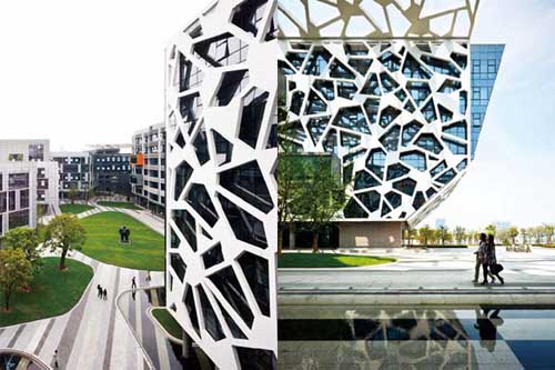 阿里巴巴杭州总部的新楼辨识度很高—外部有蜘蛛网状的解构,装饰性极强地从外墙延伸往上,把7栋高低不 一的建筑连成一个综合体,同时也可遮挡阳光。设计的灵感来自于中式的古典窗格,投下的倒影美观,功能上也可保证通风凉爽,减少空调使用,低碳环保。除了设 计上的新颖,它最重要的一点是让在其间工作的员工感到有爱。