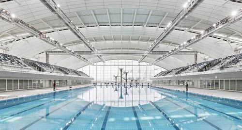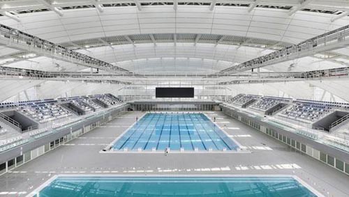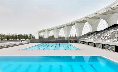 游泳馆外部效果 游泳馆共设有3500个固定座位(世界游泳锦标赛后将增加为5000个座位),并排设有四个泳池。为了能在这个场馆总同时举办各项体育赛事和活动,四个泳池中有两个是标准尺寸,一个跳水池和一个休闲泳0池。