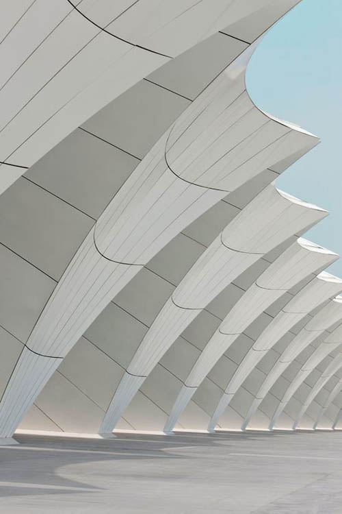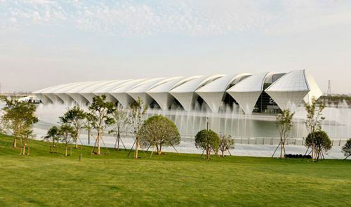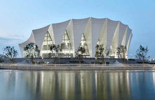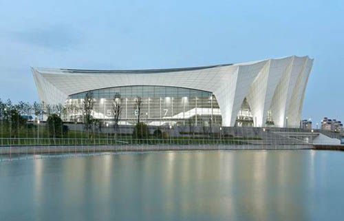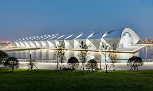 整体效果 这座场馆建在上海黄浦江沿岸的闲置用地上,整个设计包括三个独立建筑体量,以容纳大量观众、比赛活动和游泳池等设施。尺寸形状各不相同的白色弯曲结构体和重复排列的巨大拱璧像风帆一样漂浮在黄浦江畔。