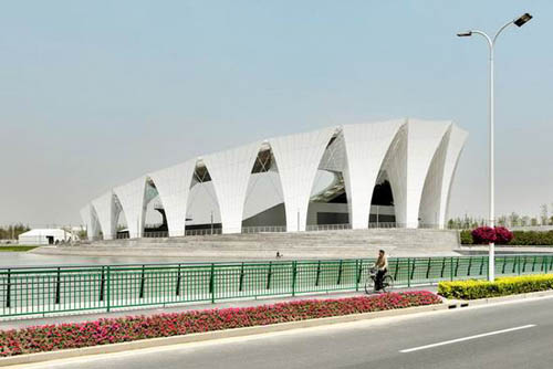 体育场馆入口 曲线形的体育馆建筑包含了一个室外游泳池,并在视线上与一系列人工池塘和小岛相连。平静的水面反射了建筑物的倒影,将周边分散的区域连接到一起,并增添了整个竞赛场馆区的自然氛围。