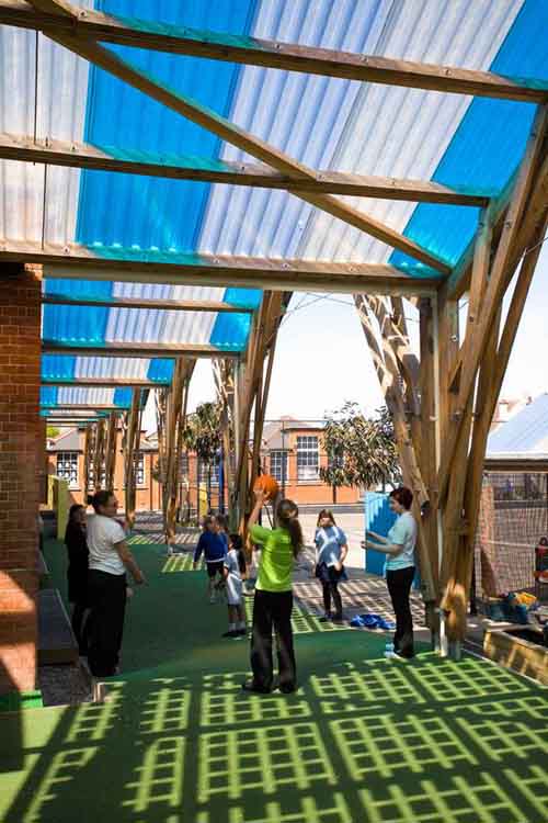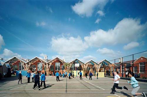 外廊 由一系列弯曲的木条组成的复杂柱子支撑着锯齿形的斜屋顶。一半屋顶覆盖了太阳能光电板,另一半则由蓝色的半透明板组成。外廊上还设有一个专门展示节能指标的计数器,不仅让周边社区居民了解了这方面的信息,同时潜移默化的培养了小学生的环保意识。