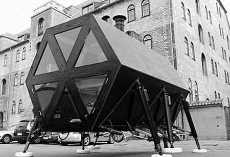 (图片来源:山西晚报) 行走的房子 像不像“哈尔的移动城堡”?这个房子来自丹麦,长3.72米,高和宽为3.5米,重1200公斤,有6条步进液压腿,行走的最高速度是60米/小时,屋内设施齐全。太阳能和风能是其蓄电池的能量来源。这间房子还可以根据居住人员的数量扩展面积。