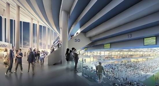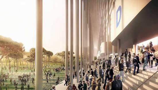 入口(图片来源:designboom) 体育场位于城市绿化带上,这个设计力求与周边自然环境建立一个有机的联系。这座对称的建筑外部包裹了一层轻薄薄膜并由无数纤细的柱子支撑,好像悬浮在空中一样。