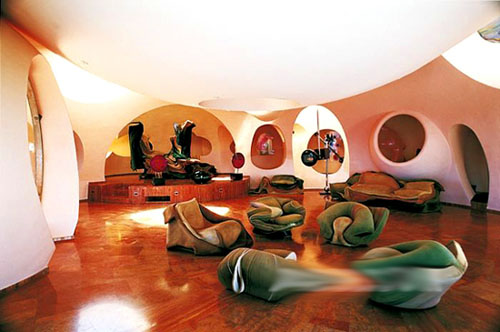 (图片来源:a963) “设计皇帝”皮儿·卡丹的住宅 法国嘎纳“泡泡宫” 建筑师Lovag的观点是:我们的四肢的运动轨迹是圆形,视觉的范围也接近圆形。欢乐是圆形的,圆形是人类的行为方式。他把这一概念用于建筑设计中。以此理论为依据,设计了原型和实验的结构。