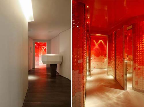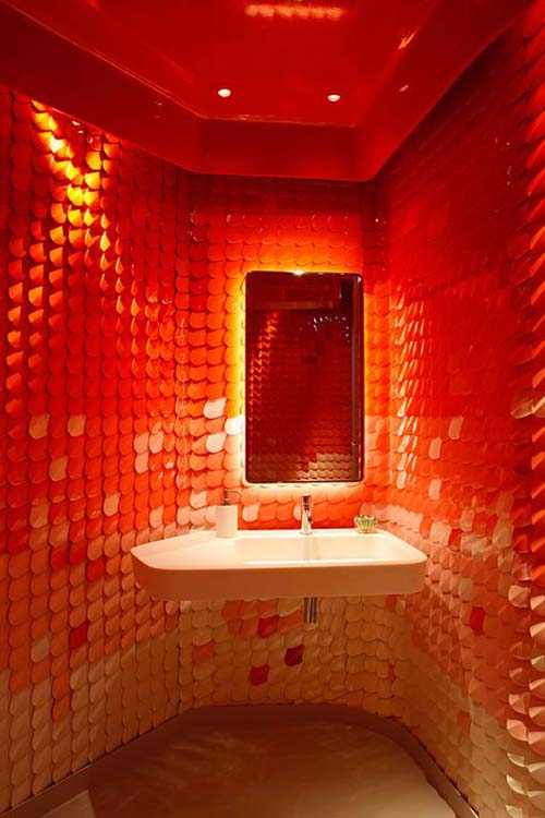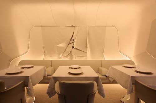 带有鱼鳞效果的洗手间墙面 第二个餐厅的设计概念是蚕蛹。设计师希望创造一个内向型的、温馨的空间氛围。白色的柔软布面将整个室内空间纳入其中,包括天花板、墙面和桌椅。因为布褶而形成的丰富光影为这个单色的空间增加了深度。