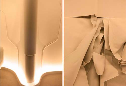 (左)凹圆形暗槽灯照亮了白色的布褶;(右)折叠的布面和光影创造了微妙而丰富的效果