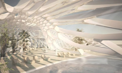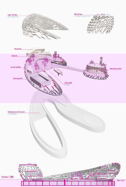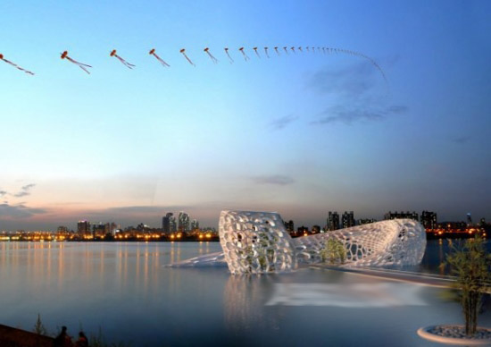 这是一个暂未实施的设计项目,位于韩国首尔,项目名称为“水舞馆”,它有着非常优雅的建筑形态,好似一条美人鱼歇息在水面之上。外观设计采用了水波纹的元 素,当阳光透射时,建筑室内室外的墙面都能呈现波光粼粼的效果。舞水馆是为公众休息空间,空间的运用是灵活的,可以举办演唱会,展览等活动。