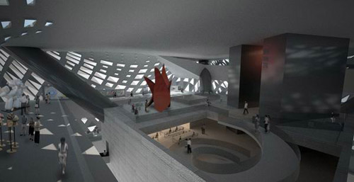 (图片来源:designboom) 博物馆的画廊被安排在一个连续的边缘坡道上,这一空间围绕着艺术资源中心螺旋向上。行政管理区则位于建筑的最顶层,而儿童博物馆位于建筑底层。在内部布局 交叉的地点,一系列连续的金属板从一个角落延伸到另一个,支撑了整个外部结构。外表皮包裹在主要的承重柱子上,形成了一个双曲线形的玻璃立面结构,这种表 皮结构可以帮助收集雨水、放置太阳能光电板并安装活动窗以促进室内通风。建筑周围的园林区域内种植了超过750~1250棵树木以吸收各种设施排放的二氧 化碳废气。