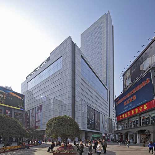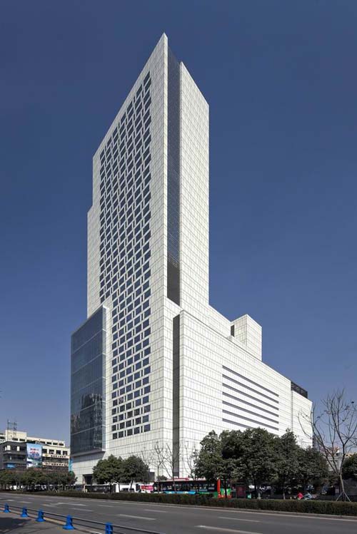 (图片来源:GP建筑) 芝加哥时间 – (2011年8月) – 最近一栋位于中国成都的37层高的综合开发楼临近竣工,且第一期 – 111,500平米的群光广场百货已经开张。该综合体大楼位于紧靠着成都商业中心的城市街区广场,主要由一座12层的百货商场以及一座25层的君悦酒店组成。 该商业综合体的设计最大限度地满足了现有城市肌理的特定功能需求。通过将酒店塔楼不对称地堆叠至商业裙房上,使建筑体量与周围环境整合为一。裙房入口面向 北侧则为与活跃的城市广场创造了非常理想的联系。酒店塔楼位于基地南面,为所有的酒店客房提供了广阔的视野和充足的阳光。裙房和塔楼两个体块的协调是由一 系列阶梯型的屋顶花园所统一,这些花园可通过通酒店的空中大堂、宴会厅和餐饮设施到达。