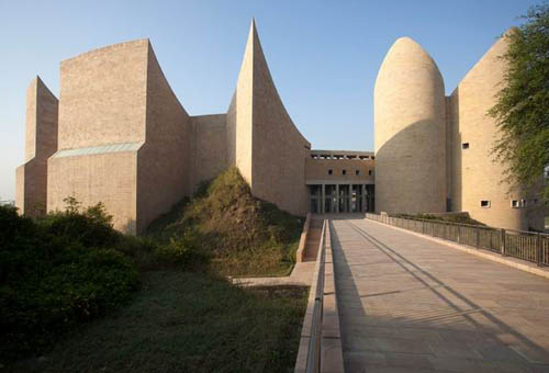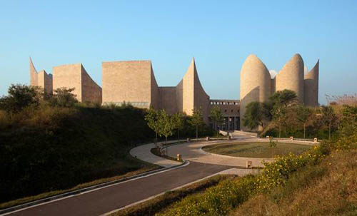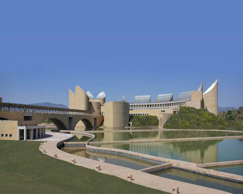 (图片来源:designboom) 这个项目的西半部分包括一个入口广场,礼堂,图书馆和可交换的展览空间。而在东半部分,设置了一些拥有永久展品的画廊,它们起伏的屋顶模仿了喜马拉雅山的 形状。展厅建筑上的五瓣屋顶代表了锡克教教义中的五种美德。拱廊和混凝土柱子支撑起了整个外表皮,同时还装饰了彩色的gwalior石材。不锈钢材质的屋 顶根据不同的天气状况,反映出多种多样的形式,而从峡谷穿过的河流为建筑群引入了一个引人入胜的水上花园。