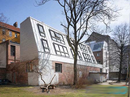 (图片来源:自由建筑报道) 这座位于柏林的房屋在其200年的历史中不断变化和成长。它初建于1828年,随后的日子里正面不断进行补充,庭院一边增加了附属建筑,成为小型公司所在 地和娱乐场所如保龄球场等。在200年的岁月里,它从一座铜覆面的房屋转变为咖啡屋、酿酒厂、锁匠屋、木工作坊以及各种餐馆和酒吧等。
